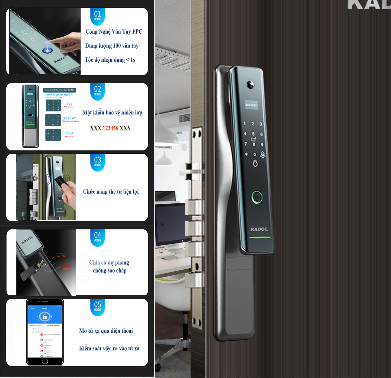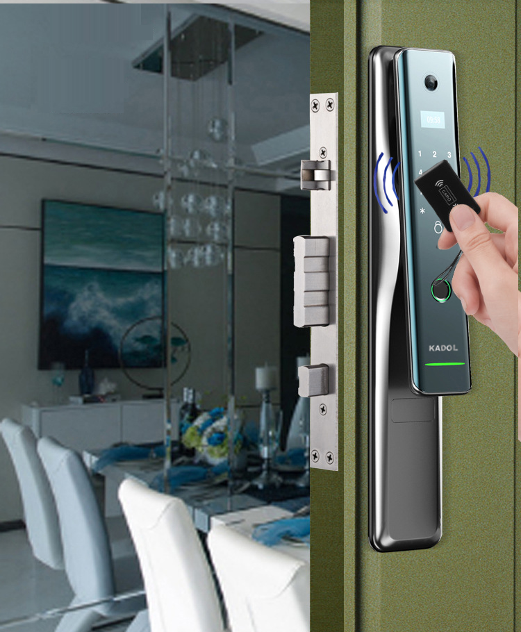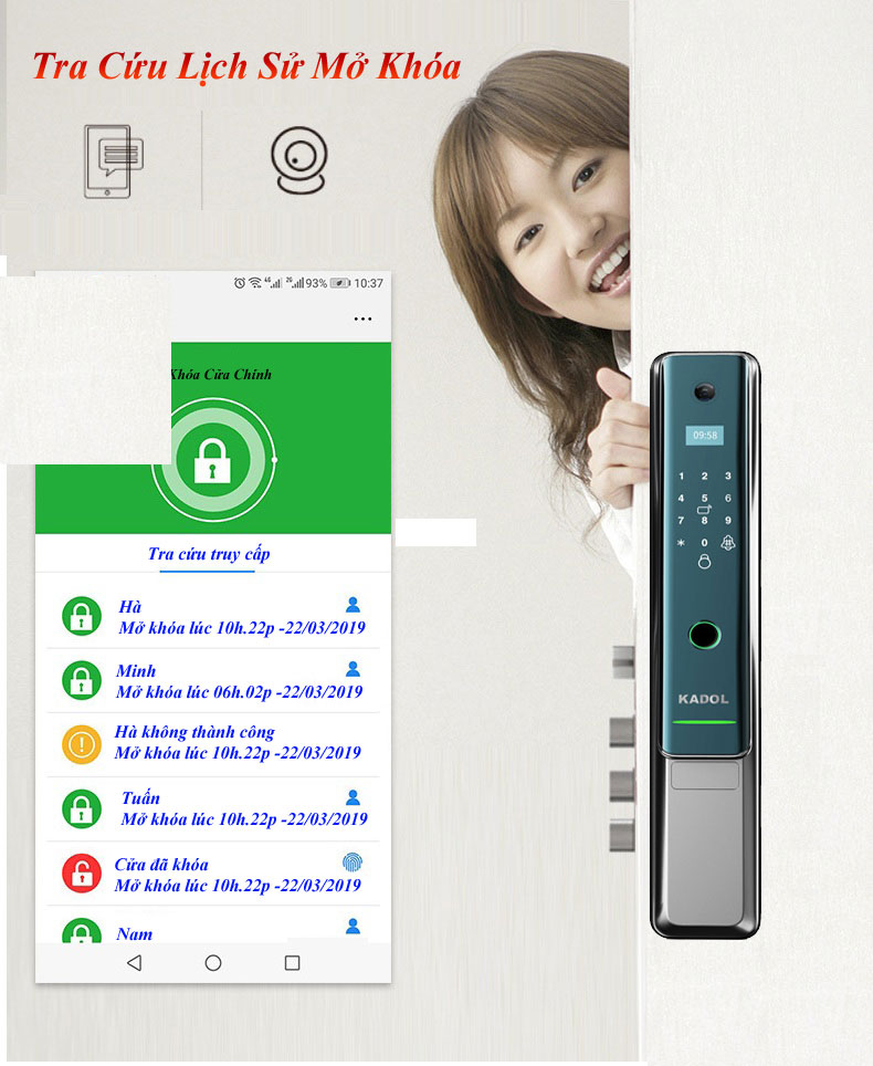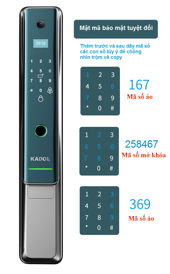 Khóa cửa vân tay trang bị chuông gọi cửa Camera. Khóa vân tay mở từ xa bằng điện thoại qua wife và 4G. Đây là sản phẩm ứng dụng công nghệ IOT và tính hữu dụng của nó như: Mở khóa cho người thân khi bạn vắng nhà, quản lý thời gian mở của của các thành viên, kết nối với hệ thông nhà thông minh,….là một trong những thương hiệu hàng đầu về khóa cửa thông minh tại Việt Nam. KADOL được biết đến bởi chất lượng cao, thiết kế tinh sảo với mức giá thành hợp lý với đại đa số gia đình,là dòng sản phẩm khóa vân tay dành cho gia đình, phù hợp lắp khóa cửa phòng ngủ, khóa cửa thông phòng. Ưu điểm của khóa là giá tốt, bảo hành 2 năm. Ngoài ra có đầy đủ các tính năng tối ưu như: Cảm biến vân tay FPC, chất liệu hợp kim, chốt riêng tư…..