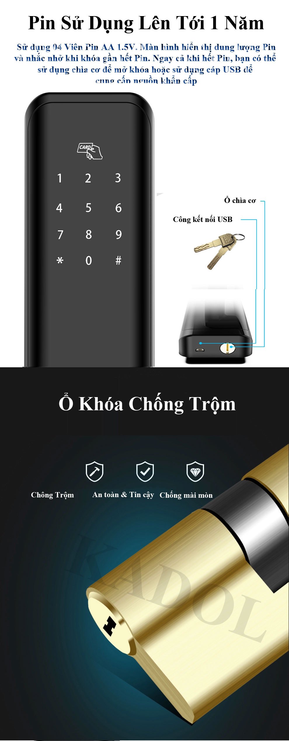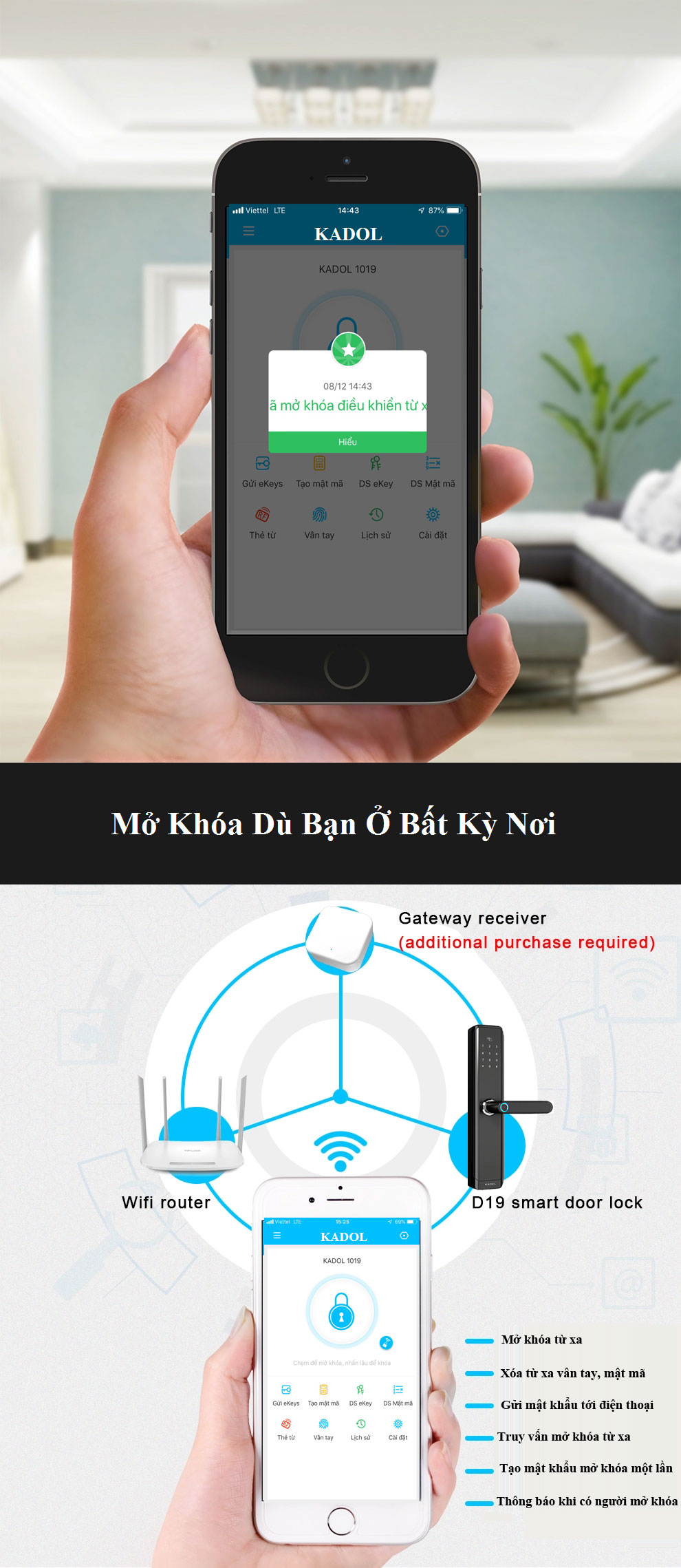 hóa vân tay mở từ xa là xu thế 2019. Kadol đã là một trong những thương hiệu khóa cửa lớn tại Việt Nam. Người tiêu dùng biết đến sản phẩm của KADOL bởi chất lượng tốt. Và những thiết kế tinh sảo. Không dừng lại ở những dòng khóa dành cho cửa Nhôm; KADOL đã ra mẫu khóa mới tích hợp nhiều tính năng mở khóa xu thế 4.0 Khóa vân tay mở từ xa bằng điện thoại qua wife và 4G. Đây là sản phẩm ứng dụng công nghệ IOT và tính hữu dụng của nó như: Mở khóa cho người thân khi bạn vắng nhà, quản lý thời gian mở của của các thành viên, kết nối với hệ thông nhà thông minh,….